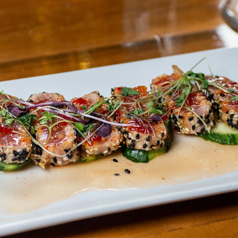 Fried tofu tossed in sweet chili sauce, finished with radishes, jalapenos, and sesame seeds.